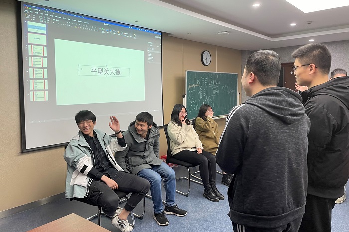 随后,支部开展了“你比划我猜”党史知识竞赛。比赛自由组合,四人一组,二人比划两人猜词,在15分钟内答对题目最多的一组获胜。题目涉及中国共产党党史、十四五精神、习近平新时代中国特色社会主义思想等。