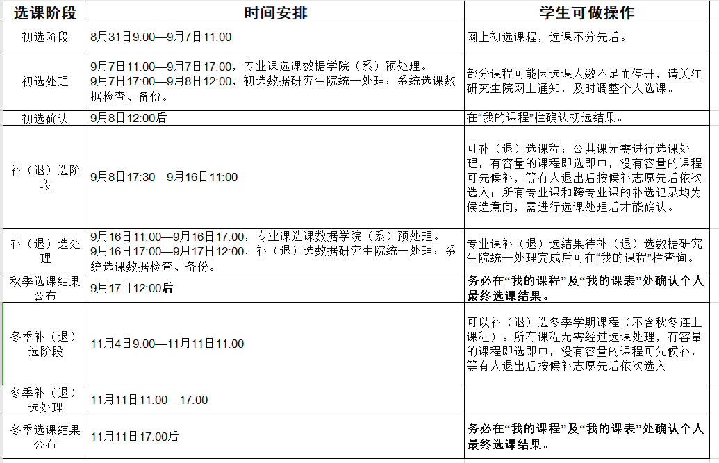 本次选课分初选、补(退)选、冬季补(退)选三个阶段,具体时间安排详见下表。