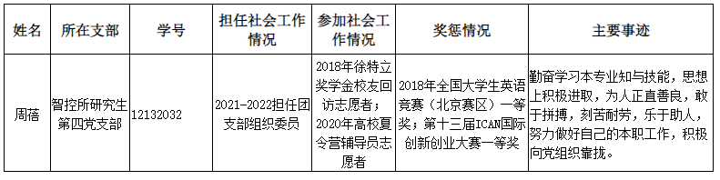 经控制学院智控所研究生第四党支部认真考察讨论,拟将周蓓同志转为正式党员,现予公示: